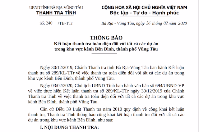 Trước đó, thông báo số 240 ngày 26/2/2020 của Thanh tra tỉnh Bà Rịa - Vũng Tàu về Kết luận thanh tra toàn diện đối với tất cả dự án trong khu vực kênh Bến Đình, TP Vũng Tàu, dự án Khu nhà ở Decoimex mở rộng được khởi công năm 2009.