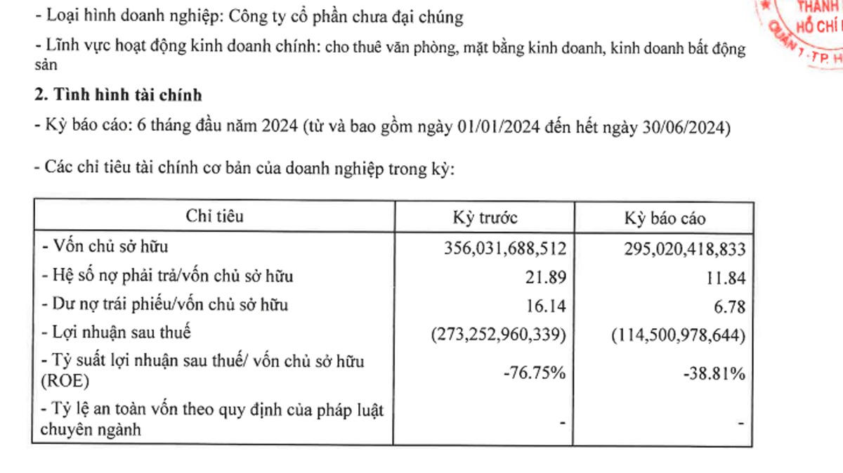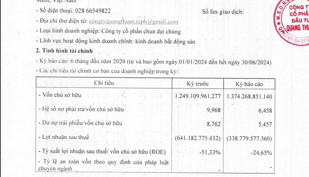 Cũng theo báo cáo gửi HNX, CTCP Quang Thuận có tổng nợ phải trả tính tới cuối tháng 6/2024 là 8.875 tỷ đồng, trong đó tổng dư nợ trái phiếu khoảng 7.500 tỷ đồng so với vốn chủ sở hữu hơn 1.374 tỷ đồng.