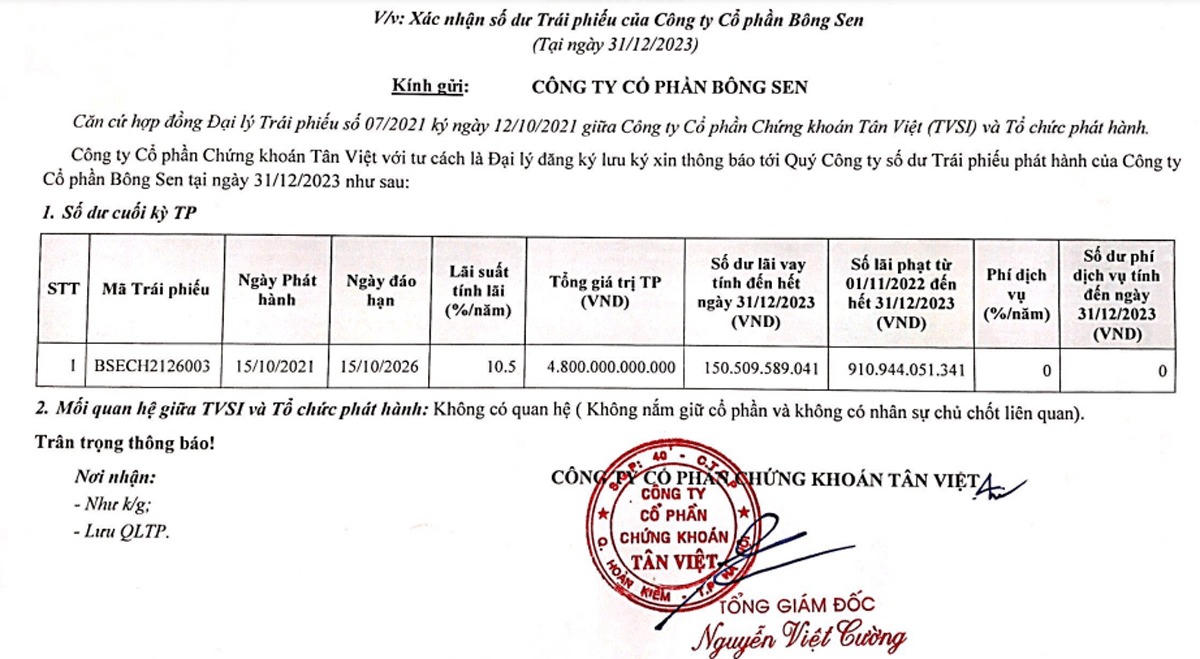 Tính tới cuối năm 2023, Bông Sen có lô trái phiếu BSECH2126003 phải thanh toán gốc là 4.800 tỷ đồng và số tiền lãi và phạt là hơn 1.061 tỷ đồng. Tuy nhiên, Bông Sen đã chậm/không thanh toán gốc, lãi vì “tài khoản bị phong tỏa”.