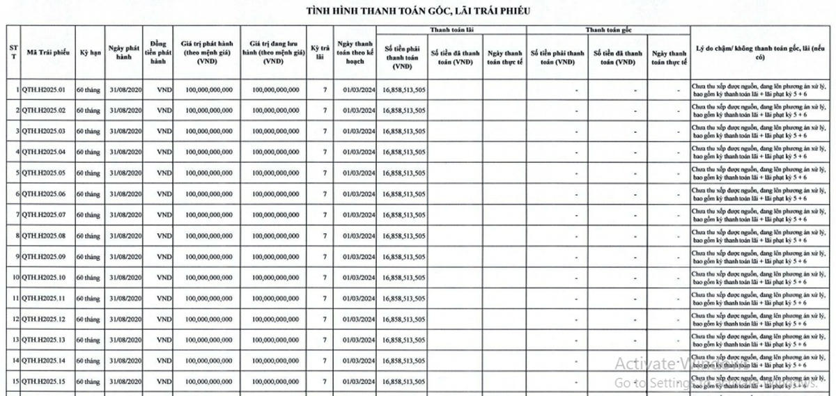 Trong nửa đầu năm nay, Quang Thuận đã chậm trả lãi và phạt với 60 lô trái phiếu (mỗi lô giá trị 100 tỷ đồng). Tổng tiền lãi và phạt là gần 16,86 tỷ đồng/lô, tương đương khoảng 1.010 tỷ đồng do chưa thu xếp được nguồn vốn và “đang lên phương án xử lý”.