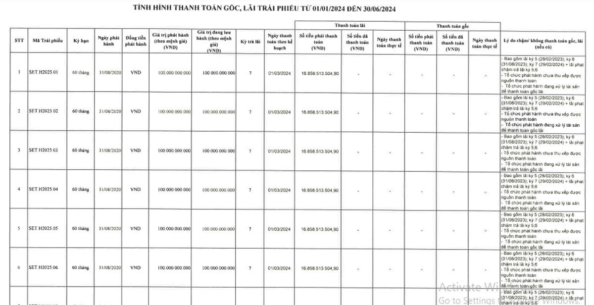 Lý do chậm thanh toán là do Setra chưa thu xếp được nguồn thanh toán và tổ chức phát hành đang xử lý tài sản để thanh toán gốc lãi.