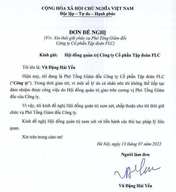 Hội đồng Quản trị Công ty CP Tập đoàn FLC (FLC) vừa có thông báo về việc chấp thuận đề nghị thôi giữ chức vụ phó tổng giám đốc của bà Vũ Đặng Hải Yến.