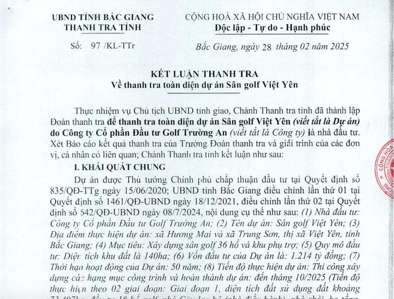 Kết luận thanh tra của Thanh tra tỉnh Bắc Giang đã chỉ ra nhiều thiếu sót, sai phạm tại dự án sân golf Việt Yên do Công ty cổ phần Đầu tư Golf Trường An là nhà đầu tư.