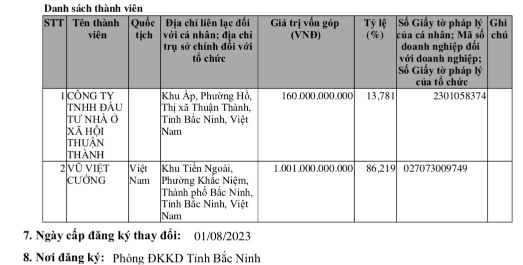 Đáng chú ý, thành viên góp vốn lúc này có sự xuất hiện của Công ty TNHH Đầu tư nhà ở xã hội Thuận Thành (góp 160 tỷ đồng, tỷ lệ 80%) và Vũ Việt Cường góp 40 tỷ đồng (tỷ lệ 20%). Hai cổ đông Nguyễn Văn Trung và Nguyễn Văn Quế không còn trong danh sách thành viên.