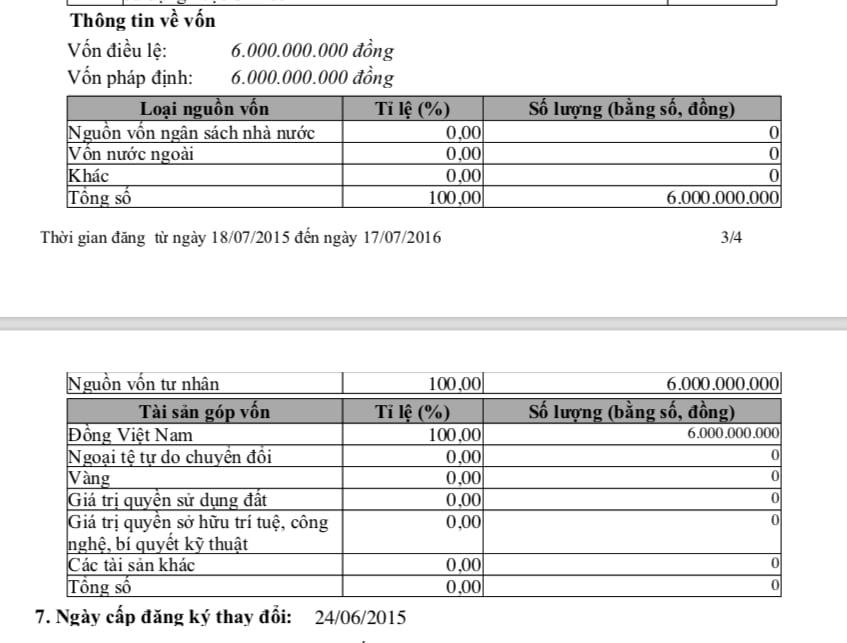 Đồng thời công ty cũng nâng vốn điều lệ từ 6 lên 22 tỷ đồng. Thành viên góp vốn gồm: Nguyễn Văn Trung góp 15,4 tỷ đồng; Vũ Việt Cường góp 4,4 tỷ đồng và Nguyễn Văn Quân góp 2,2 tỷ đồng.