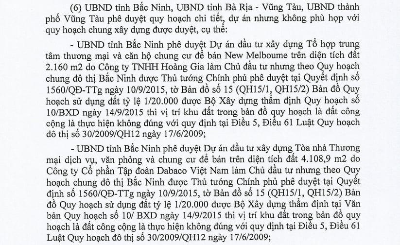 Thanh tra Chính phủ chỉ ra nhiều dự án xây dựng tổ hợp trung tâm thương mại và chung cư để bán nằm trên diện tích được Thủ tướng Chính phủ quy hoạch là đất công cộng. Trong đó có án Tổ hợp trung tâm thương mại và căn hộ chung cư để bán New Melboume, tỉnh Bắc Ninh.