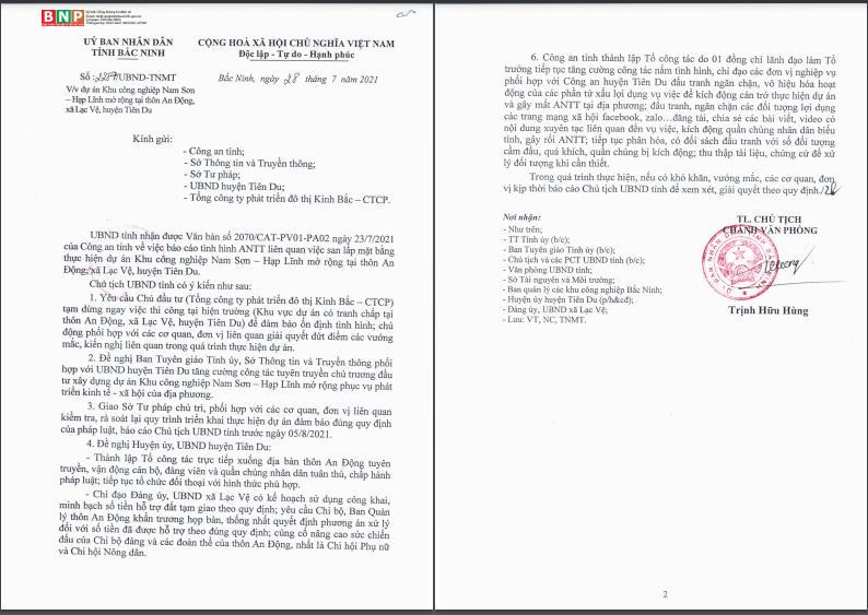 Theo đó, UBND tỉnh Bắc Ninh cho biết vừa nhận được văn bản số 2070/CAT-PV01-PA02 ngày 23/7/2021 của Công an tỉnh về việc báo cáo tình hình an ninh trật tự liên quan đến việc san lấp mặt bằng thực hiện dự án Khu công nghiệp Nam Sơn – Hạp Lĩnh mở rộng tại thông An Động, xã Lạc Vệ, huyện Tiên Du.