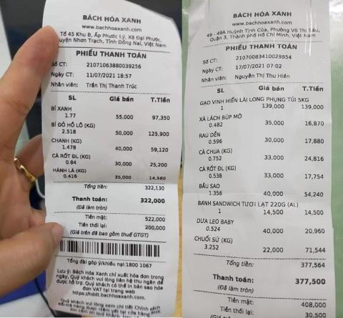 Trước đó, nhiều người chia sẻ hai tờ hóa đơn mua hàng tại BHX, một tờ được in vào ngày 11/7, tờ còn lại được in vào ngày 17/7. Theo tờ hóa đơn ngày 11/7 thì một số mặt hàng tại BHX có giá như sau: Giá bí xanh 55.000 đồng/kg; bí đỏ hồ lô 50.000 đồng/kg; chanh tươi 40.000 đồng/kg; cà rốt Đà Lạt 30.000 đồng/kg; hành lá 35.000 đồng/kg.
