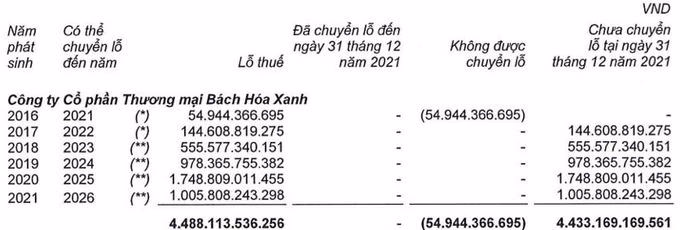 Thế giới di động cũng có giải trình, các khoản lỗ thuế năm 2016, 2017 là khoản đã được tính theo biên bản quyết toán thuế. Còn lỗ thuế các năm từ 2018-2021 ước tính theo tờ khai thuế của công ty, chưa được cơ quan thuế địa phương quyết toán.
