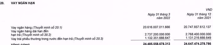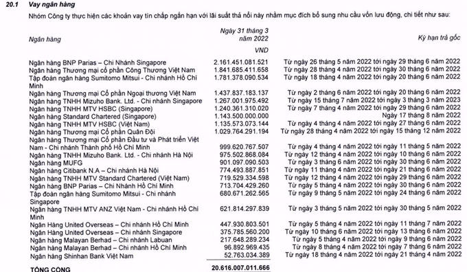 Còn khoản vay dài hạn đến hạn trả hơn 2.700 tỷ đồng từ Ngân hàng TNHH MTV HSBC (Singapore) kỳ hạn trả gốc đến 19/11/2022. Các trái phiếu thường phát hành trong nước theo dạng tín chấp trị giá hơn 1.100 tỷ đồng cũng có kỳ hạn trả gốc đến tháng 11/2022.