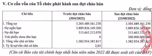 Sau gần một tháng chào bán, trái phiếu BAF đã được phân phối hoàn toàn ra thị trường, thu về 300 tỷ đồng cho công ty, nâng tỉ lệ nợ/vốn chủ sở hữu lên mức 2,21.
