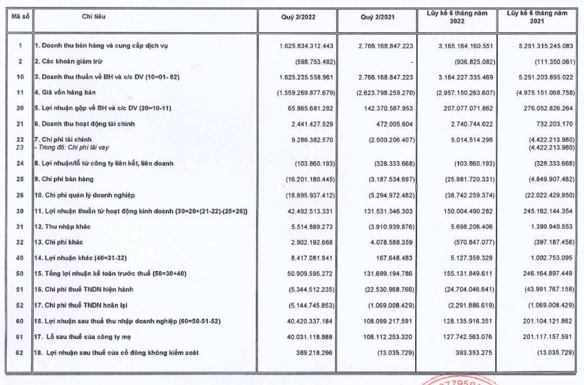 Trong năm 2022, Công ty đặt kế hoạch kinh doanh với doanh thu giảm 43% về 5.950 tỷ đồng, lợi nhuận sau thuế tăng 24,8% lên 402 tỷ đồng. Như vậy, kết thúc 6 tháng đầu năm, Công ty mới hoàn thành được 31,9% kế hoạch lợi nhuận năm.