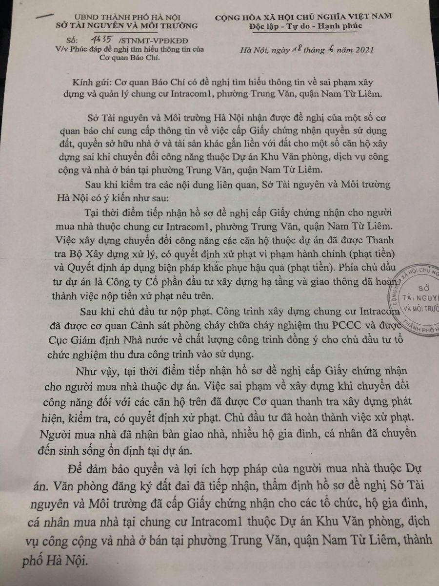 Tuy nhiên, theo lý giải của Sở Tài nguyên và Môi trường Hà Nội (TN&MT) tại thời điểm tiếp nhận hồ sơ đề nghị cấp sổ hồng cho người mua nhà thuộc chung cư Intracom 1, việc xây dựng, chuyển đổi công năng các căn hộ thuộc dự án đã được Thanh tra Bộ Xây dựng xử lý, có quyết định xử phạt vi phạm hành chính và quyết định áp dụng biện pháp khắc phục hậu quả (phạt tiền). Phía Công ty Intracom đã hoàn thành việc nộp tiền xử phạt nêu trên.