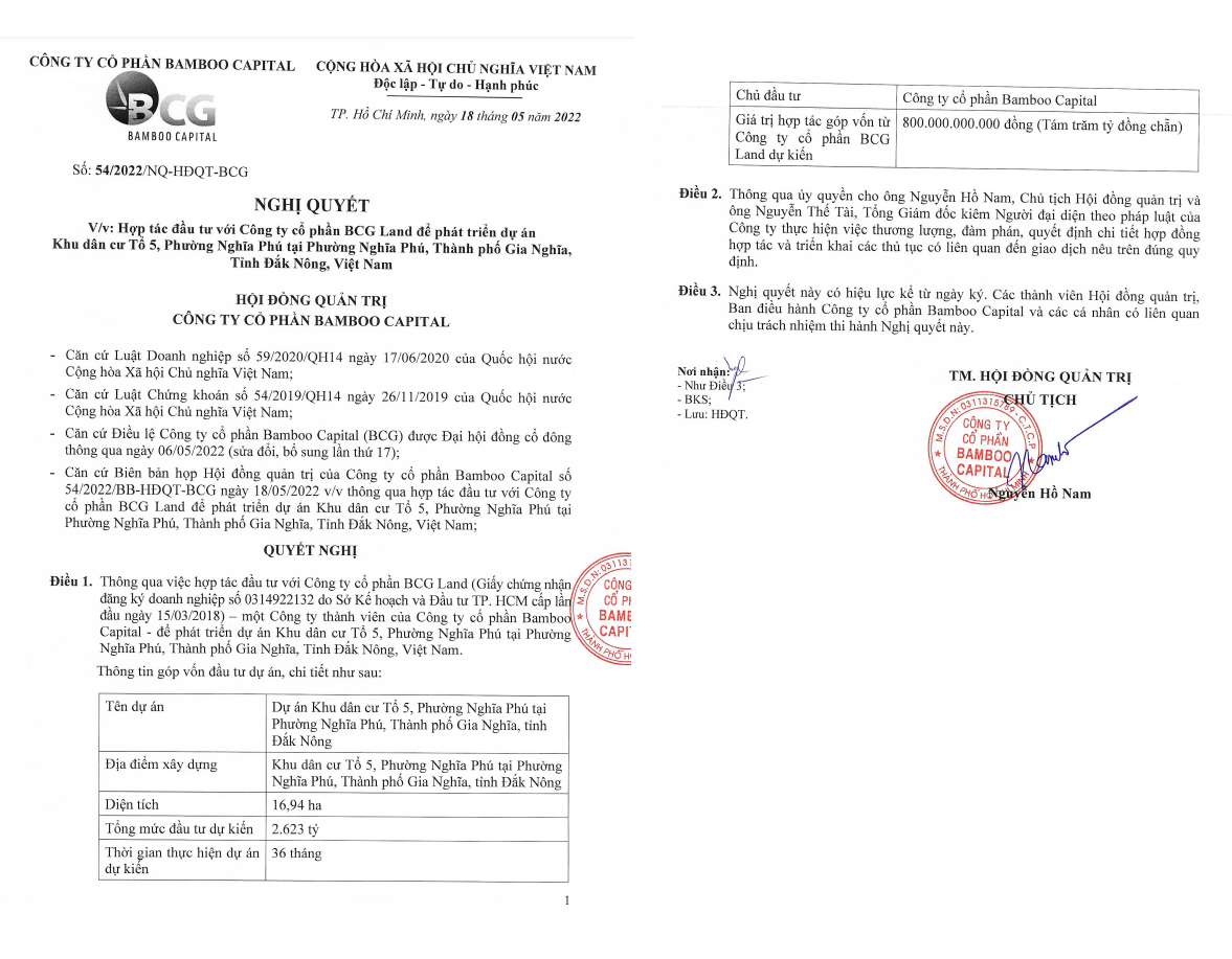 Trước đó, vào ngày 28/4 vừa qua, BCG này cũng đã thông qua nghị quyết góp vốn bổ sung 400 tỷ đồng vào BCG Land, với mục đích để BCG Land thực hiện các giao dịch liên quan đến bất động sản. Sau khi hoàn tất, tổng giá trị vốn góp của Bamboo Capital với BCG Land là 2.856 tỷ đồng, chiếm 62,10% vốn điều lệ của BGC Land.
