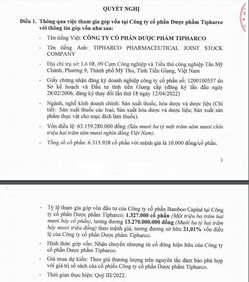 Cụ thể, tỷ lệ tham giá góp vốn đầu tư của Bamboo Capital là 1.327.000 cổ phẩn, tương đương 13.270.000.000 đồng theo mệnh giá, tương đương sở hữu 21,01% vốn điều lệ của CTCP Dược phẩm Tipharco.
