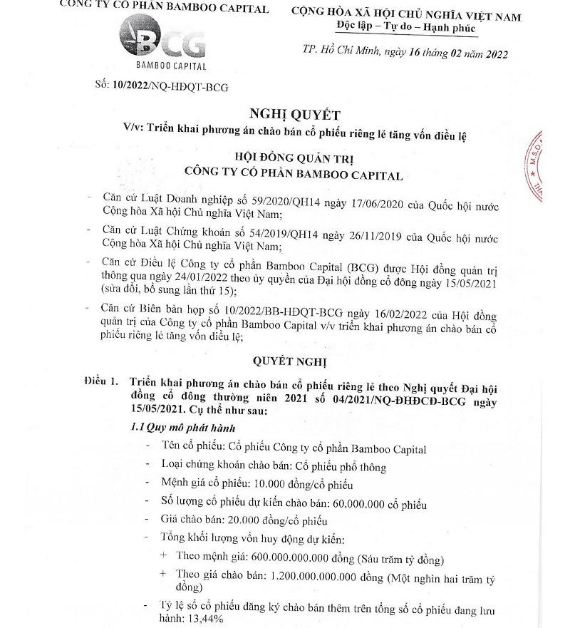 CTCP Bamboo Capital (mã chứng khoán: BCG) vừa công bố kế hoạch chào bán 60 triệu cổ phiếu riêng lẻ với giá 20.000 đồng/cp, tương đương dự kiến thu về 1.200 tỷ đồng.