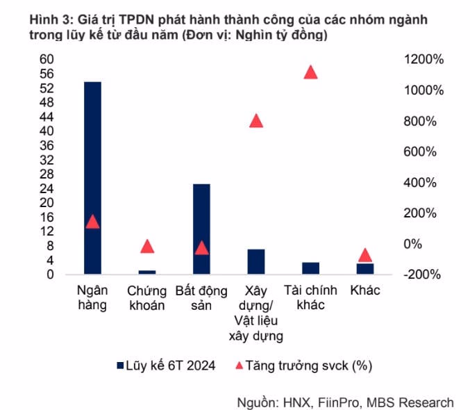 Ngoài ra, Ngân hàng vượt Bất động sản trở thành nhóm ngành có giá trị phát hành cao nhất với khoảng 53,8 nghìn tỷ đồng, chiếm tỷ trọng 57% và tăng 147% so với cùng kỳ năm ngoái.