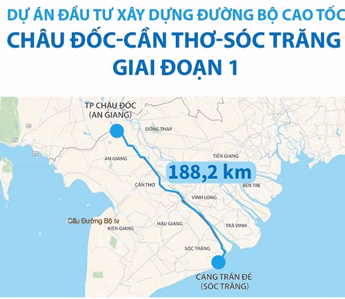 Dự án cao tốc Châu Đốc - Cần Thơ - Sóc Trăng giai đoạn 1 có chiều dài hơn 188km, quy mô 4 làn xe, đi qua địa bàn các tỉnh An Giang, Hậu Giang, Sóc Trăng và TP Cần Thơ. Điểm đầu của dự án kết nối Quốc lộ 91 (tỉnh An Giang), điểm cuối giao đường Nam Sông Hậu kết nối đường dẫn cảng Trần Đề (tỉnh Sóc Trăng).