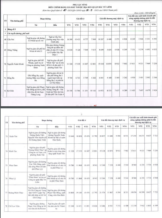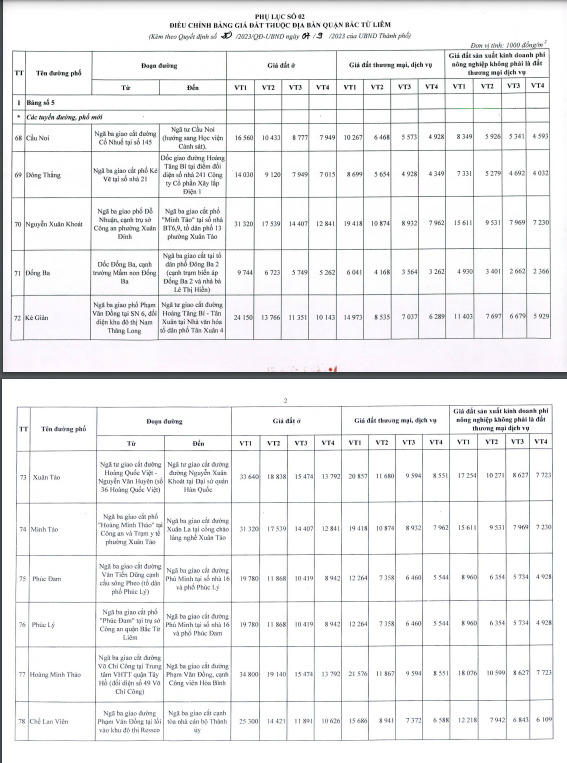 Bảng giá đất mới nhất tại các quận huyện Hà Nội