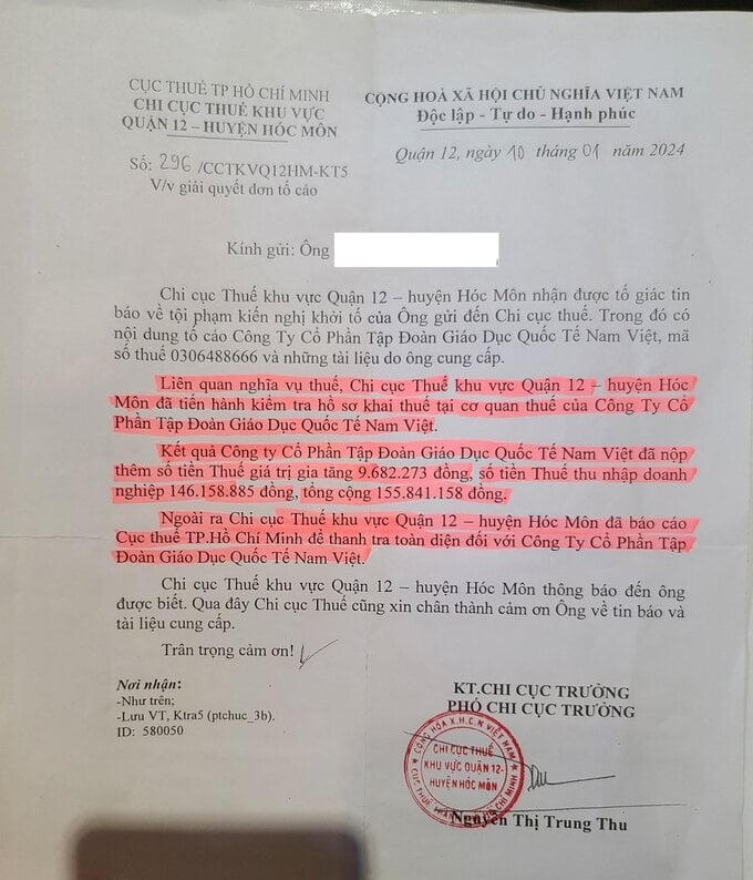 Chi cục Thuế khu vực Quận 12 – huyện Hóc Môn đã có công văn trả lời ông H.H.C (ngụ phường Tây Thạnh, quận Tân Phú, Tp.HCM) tố cáo Công ty Cổ phần Tập đoàn Giáo dục Quốc tế Nam Việt (MST 0306488666) và tiến hành kiểm tra hồ sơ khai thuế tại cơ quan thuế của doanh nghiệp này.