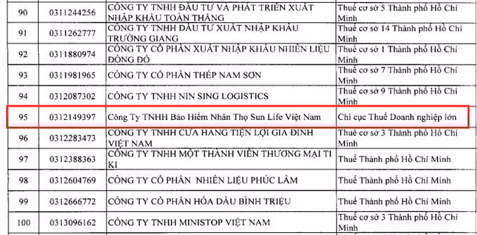 Trong danh sách hơn 300 doanh nghiệp kiểm tra thuế lần này có Cty THNN Bảo hiểm Nhân thọ Sun Life Việt Nam (Sun Life Việt Nam) , đơn vị do Chi cục Thuế Doanh nghiệp lớn quản lý.