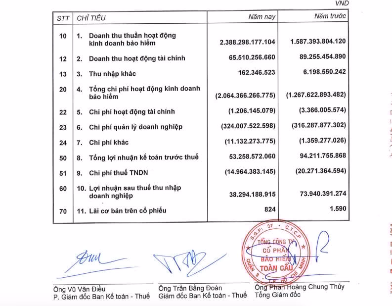 Sau khi trừ đi các chi phí, Bảo hiểm Toàn Cầu báo lãi sau thuế năm 2024 là gần 38,3 tỷ đồng, giảm 48% so với năm 2023 (báo lãi hơn 73,9 tỷ đồng).