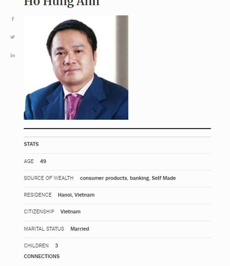 Hai đại gia kín tiếng Việt vào danh sách giàu nhất hành tinh. Việt Nam được biết đến nhiều hơn sau những thành quả về kinh tế, những sự kiến lớn và sự bứt phá của các doanh nhân giàu có, tham vọng.