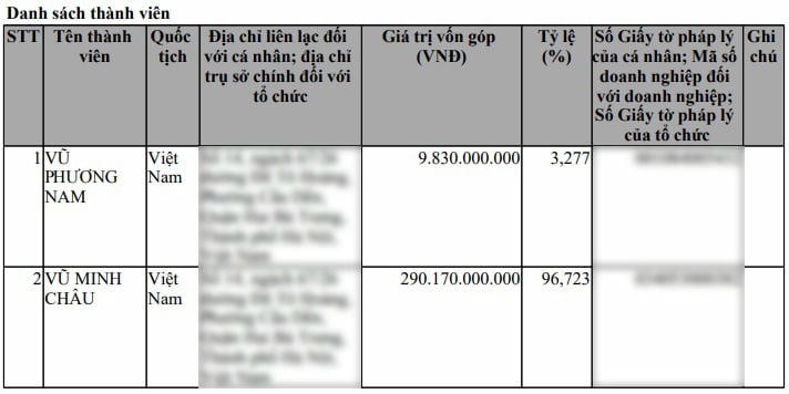 Tháng 6/2024, Bảo Tín Minh Châu tiến hành nâng vốn điều lệ lên thành 300 tỷ đồng. Lúc này, ông Vũ Minh Châu góp 290,12 tỷ đồng, sở hữu 96,723% cổ phần; ông Vũ Phương Nam giữ nguyên phần vốn góp 9,83 tỷ đồng, tương ứng 3,277% cổ phần.