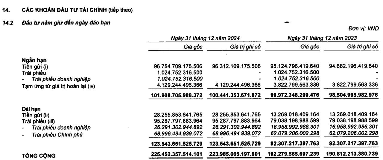 Đối với đầu tư tài chính dài hạn, đạt 123.543 tỷ đồng tại thời điểm cuối năm 2024, tăng thêm gần 34% so với cùng kỳ. Trong đó, tiền gửi chiếm 28.256 tỷ đồng, trái phiếu chiếm 95.288 tỷ đồng (26.291 tỷ đồng trái phiếu doanh nghiệp và 68.996 tỷ đồng trái phiếu Chính phủ). Được biết, các lô trái phiếu có lãi suất đến 8,9% mỗi năm.