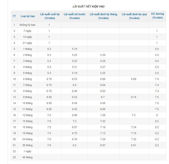Trong khi đó, lãi suất 6,75%/năm được áp dụng cho các kỳ hạn 6 - 8 tháng. Các kỳ hạn 9 – 11 tháng cùng hưởng lãi suất 6,85%/năm.