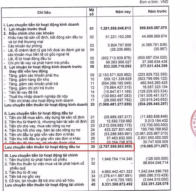 Cũng trong năm 2021, dòng tiền thuần từ hoạt động kinh doanh cũng ghi nhận âm 1.966 tỷ đồng.