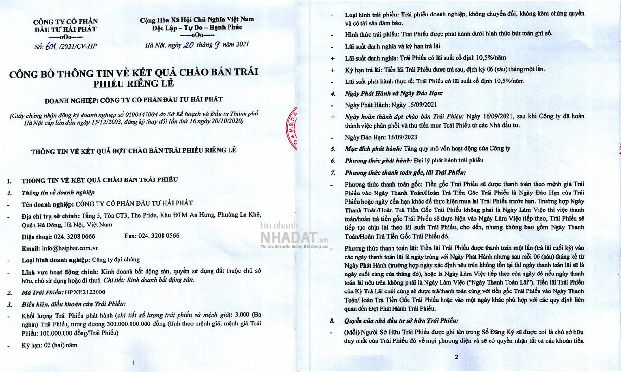 Lô trái phiếu này có kỳ hạn 2 năm (ngày đáo hạn 15/9/2021) và lãi suất thấp nhất là 10,5% mỗi năm. Hải Phát cho biết, mục đích phát hành nhằm tăng quy mô vốn hoạt động của công ty. Ngày phát hành là 15/9/2021 và ngày hoàn thành đợt chào bán là 16/9/2021.
