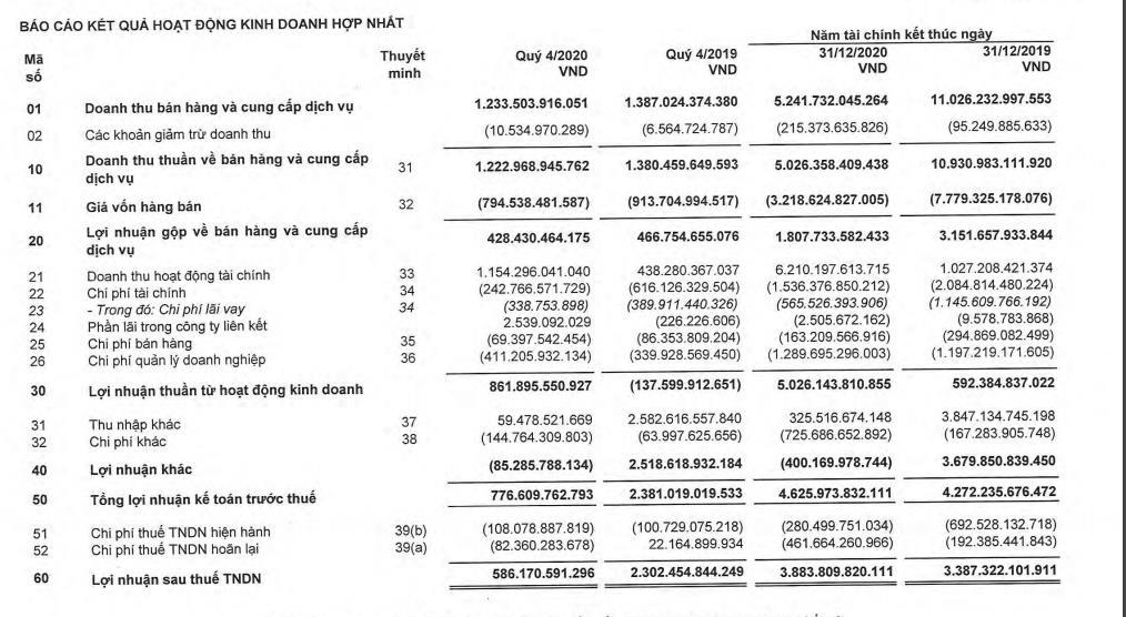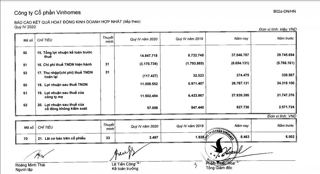 Tổng lợi nhuận hợp nhất trước thuế đạt 37.047 tỷ đồng và lợi nhuận sau thuế của công ty mẹ đạt 27.839 tỷ đồng, tăng lần lượt 25% và 28% so với năm 2019. Thu nhập trên mỗi cổ phần (EPS) trong năm 2020 đạt 8.463 đồng, tăng 30% so với năm 2019.