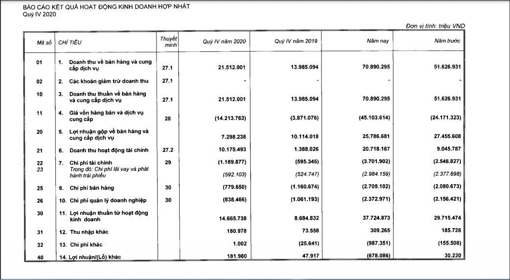 Tính riêng quý IV/2020, tổng doanh thu thuần hợp nhất của Vinhomes đạt 21.512 tỷ đồng, tăng 54% so với cùng kỳ năm 2019 chủ yếu do công ty bước vào thời kỳ bàn giao lớn với các sản phẩm bàn giao chủ yếu của 4 dự án Vinhomes Ocean Park, Vinhomes Grand Park, Vinhomes Smart City và Vinhomes Symphony.
