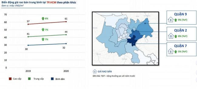 Tuy nhiên, thị trường vẫn dành tỷ trọng quan tâm lớn nhất đến chung cư trung cấp. Tổng kết 10 năm (từ 2009 – 2019), Batdongsan.com.vn thấy rằng tỷ lệ hộ gia đình ở chung cư tại TP.HCM tăng 67%, cao hơn Hà Nội (53%). Vị chuyên gia này dự báo, giá chung cư tại TP.HCM năm 2021 tăng 9% trong khi giá nhà riêng có xu hướng ổn định.