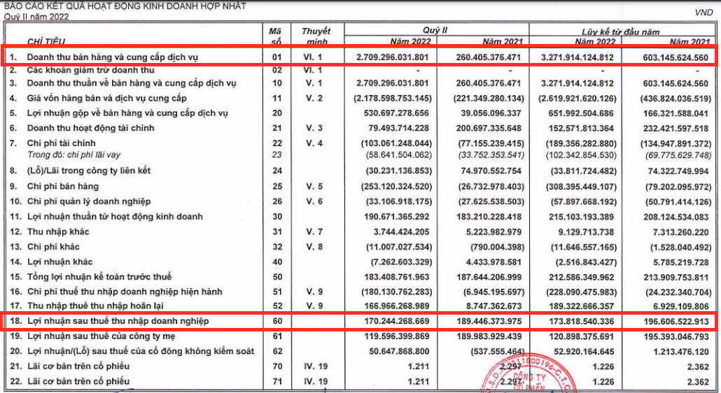 Theo Báo cáo tài chính hợp nhất quý 2/2022 của CTCP Đầu tư và Phát triển Bất động sản An Gia (Mã CK: AGG), trong quý 2, doanh nghiệp ghi nhận doanh thu 2.709 tỷ đồng, tăng tới 10 lần so với cùng kỳ năm 2021. Giá vốn hàng bán tăng 885% lên 2.178 tỷ đồng nên lợi nhuận gộp vọt từ 39 tỷ đồng cùng kỳ năm trước lên 530,7 tỷ đồng.