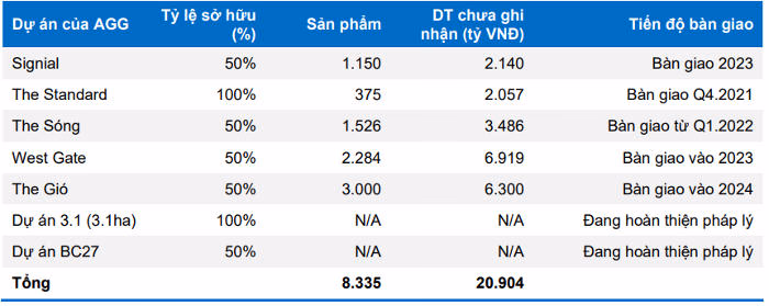 Đối với dự án BC27, BVSC đánh giá, đây là dự án có quy mô và tiềm năng nhất với AGG hiện tại. Tuy nhiên, dự án vẫn còn vướng mắc về quỹ đất kênh rạch thuộc quản lý Nhà nước. Do đó, thời điểm có thể triển khai vẫn chưa xác định.