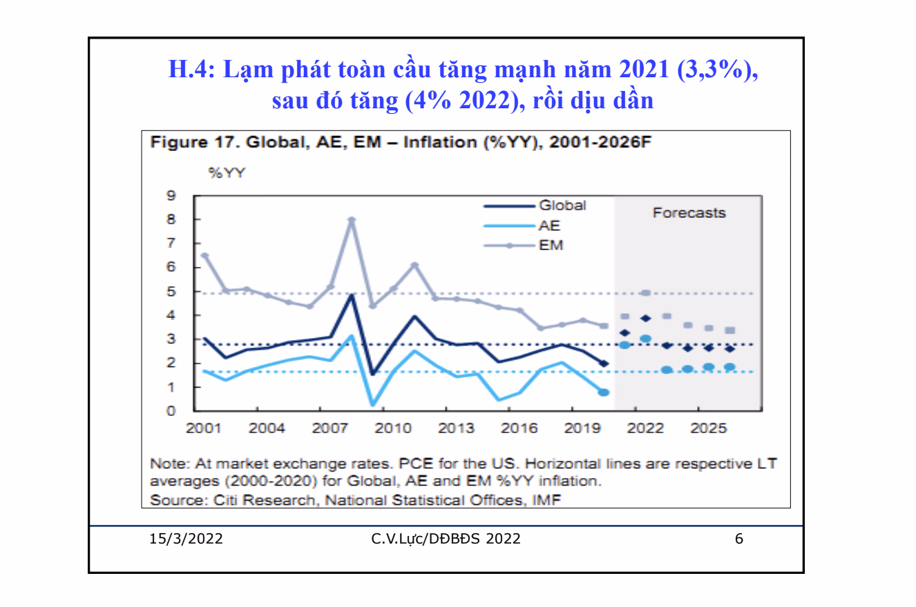 “Năm 2021, lạm phát toàn cầu tăng mạnh lên 3,3%, năm 2022 được dự báo tăng lên 4% nhưng theo chúng tôi, có thể tăng thêm 0,5 điểm % tức là đạt 4,5%. Lạm phát chủ yếu do các loại hàng hóa đều tăng như dầu khí, nhất là phân bón. Điều này sẽ ảnh hưởng lớn đến Việt Nam bởi 86% thành phần gia đình tại Việt Nam là tam nông, khi giá phân bón tăng sẽ tác động đến hoạt động sản xuất của người dân”, TS. Cấn Văn Lực chia sẻ.