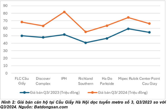 Tại Hà Nội, giá trung bình các căn hộ tại quận Cầu Giấy cho các phân khúc trong bán kính 500m so với các nha ga tuyến đường sắt đô thị Cầu Giấy - Nhổn tăng trên 40% trong vòng 1 năm (từ Quý 3 năm 2023 so với Quý 3 năm 2024).