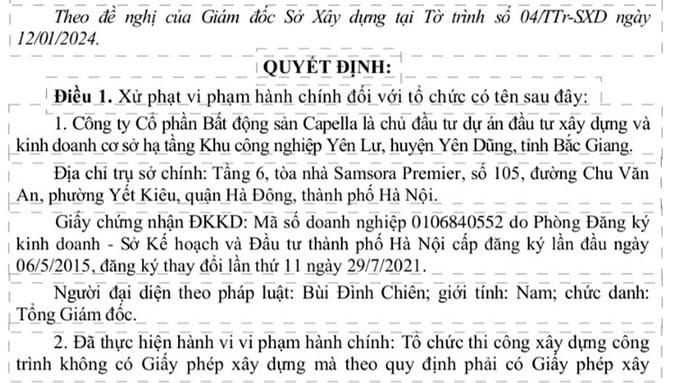 Theo thông tin từ Báo Bắc Giang, Chủ tịch UBND tỉnh Bắc Giang vừa ban hành quyết định xử phạt 135 triệu đồng đối với CTCP Bất động sản Capella (TP. Hà Nội) do xây dựng công trình không có giấy phép xây dựng theo quy định.