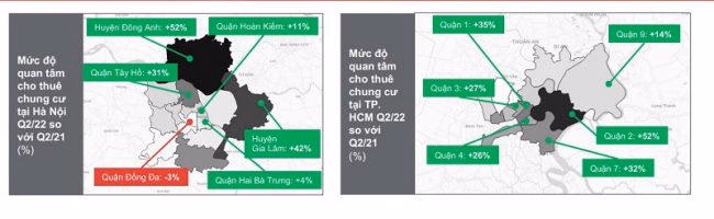 Về loại hình chung cư, mức độ quan tâm tăng chủ yếu ở ngoài trung tâm Hà Nội và phía đông TP. Hồ Chí Minh. Theo đó, mức độ quan tâm cho thuê chung cư tại Hà Nội quý 2/2022 so với quý 2/2021 ở huyện Đông Anh tăng 52%, huyện Gia Lâm tăng 42%, quận Tây Hồ tăng 31%, quận Hoàn Kiếm và quận Hai Bà trưng tăng lần lượt là 11% và 4%, tuy nhiên quận Đống Đa lại giảm 3%.