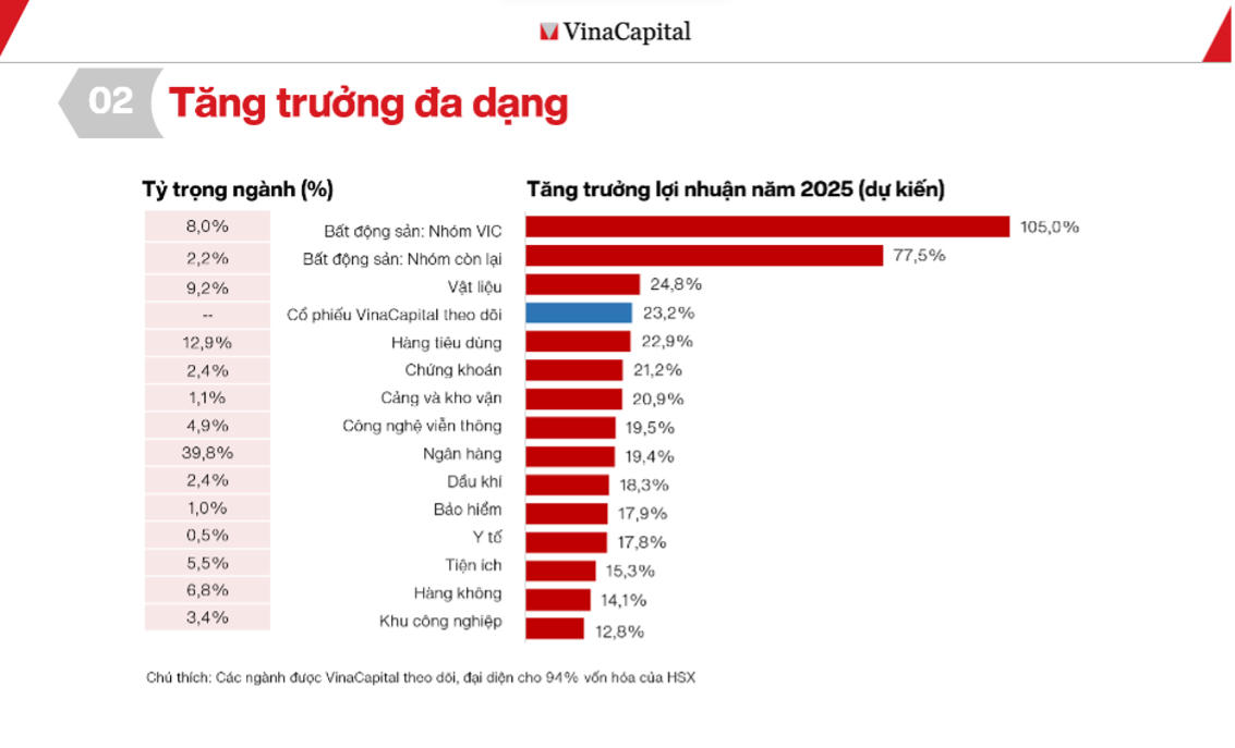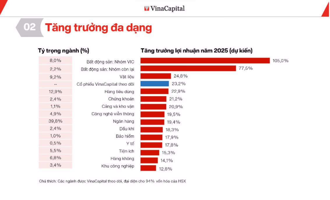 VinaCapital dự báo tăng trưởng EPS của VN-Index sẽ tăng từ 18% trong năm 2024 lên 23% vào năm 2025. Trong đó, nhóm bất động sản sẽ dẫn đầu tăng trưởng về lợi nhuận.