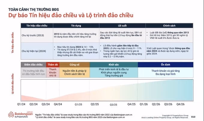 Chuyên gia của Batdongsan.com.vn nhận định, giai đoạn củng cố sẽ bắt đầu từ quý IV/2024 đến hết quý I/2025. Thời điểm này, yếu tố tiền tệ thuận lợi hơn, loại hình bất động sản có chi phí cao như nhà riêng, nhà phố dần có lợi thể. Nhìn lại chu kỳ trước của thị trường, nửa đầu năm 2014, loại hình bất động sản nhà riêng và nhà phố bắt đầu ghi nhận cải thiện về giao dịch và tin đăng.