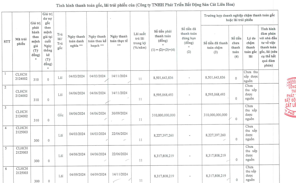 Theo bản công bố thông tin trong báo cáo về tình hình thanh toán gốc và lãi trái phiếu năm 2024, Bất động sản Cát Liên Hoa cho biết, phía công ty có nghĩa vụ thanh toán tổng cộng 14 kỳ hạn gốc và lãi cho bốn lô trái phiếu khác nhau.