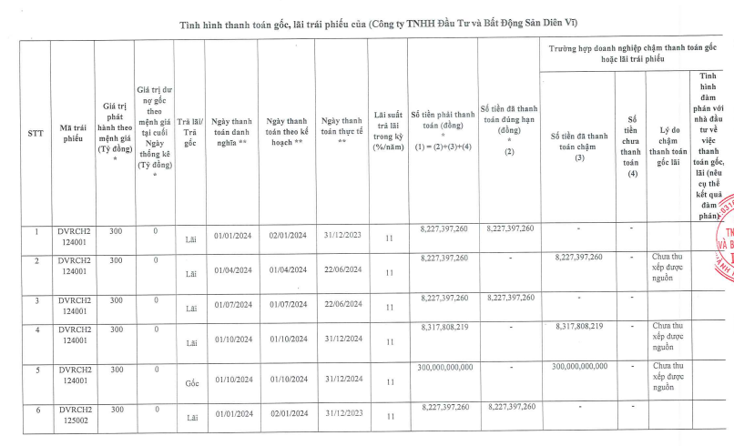 Tính đến thời điểm ngày 31/12/2024, Công ty TNHH Đầu tư và Phát triển Bất động sản Diên Vĩ mới chỉ thanh toán được hơn 51 tỷ đồng tiền gốc và lãi trái phiếu trong tổng số gần 403 tỷ đồng phải thanh toán năm 2024. Như vậy, Bất động sản Diên Vĩ còn nợ trái chủ gần 352 tỷ đồng nữa.