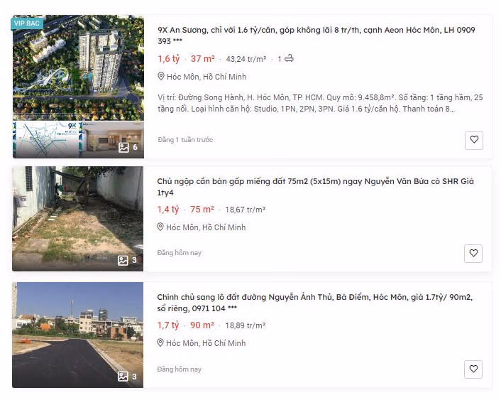 Tại căn hộ 9X An Sương đang được rao bán với mức giá 1,6 tỷ đồng/ căn với loại hình căn hộ studio cho căn 1 phòng ngủ. Giá đất cũng mềm hơn, một lô đất 75m2 mặt tiền 5m nằm tại đường Nguyễn Văn Bứa đang được rao bán với mức giá 1,4 tỷ đồng hay lô đất rộng 90m5 nằm trên đường Nguyễn Ảnh Thủ, Bà Điểm, Hóc Môn cũng đang được rao bán với giá là 1,9 tỷ đồng.