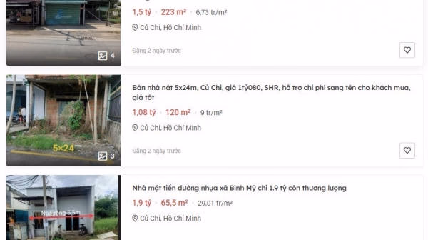 Ghi nhận tại các khu vực vùng ven TP. Hồ Chí Minh cho thấy, nguồn cung mới ra thị trường đều nằm ở ngưỡng giá vừa túi tiền của người dân. Đơn cử như tại huyện Củ Chi, nhà mặt tiền Hương Lộ 2, Tân Phú Trung rộng 223m2 được rao bán với giá 1,5 tỷ đồng có sổ hồng riêng, một căn nhà khác có diện tích 120m2 đang được ráo bán với giá chỉ 1,08 tỷ đồng hay một căn nhà mặt tiền đường nhựa xã Bình Mỹ đang được rao bán với giá giá 1,9 tỷ đồng có thương lượng.
