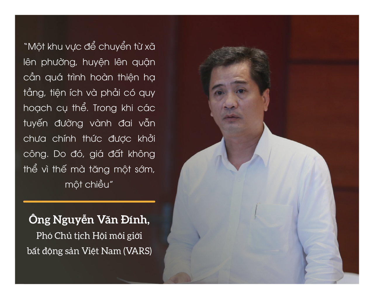 “Hơn nữa, đây mới chỉ là sự thay đổi hành chính, địa danh. Một khu vực để chuyển từ xã lên phường, huyện lên quận cần quá trình hoàn thiện hạ tầng, tiện ích và phải có quy hoạch cụ thể. Trong khi các tuyến đường vành đai vẫn chưa chính thức được khởi công. Do đó, giá đất không thể vì thế mà tăng một sớm, một chiều”, ông Đính nhận định.