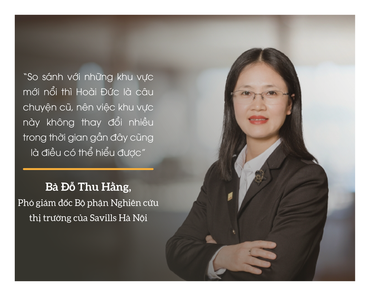“So sánh với những khu vực mới nổi thì Hoài Đức là câu chuyện cũ, nên việc khu vực này không thay đổi nhiều trong thời gian gần đây cũng là điều có thể hiểu được”, bà Hằng nói.