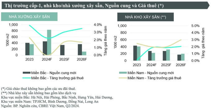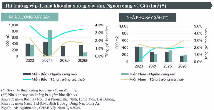 Đến hết quý 2/2024, tỷ lệ lấp đầy xưởng xây sẵn đạt 89% trong khi đó, các nhà kho tại khu vực phía Bắc duy trì ngưỡng lấp đầy 79%. Mức giá thuê của nhà xưởng xây sẵn đạt 4,9 USD/m2/tháng, tăng 1,9% theo năm trước và nhà kho xây sẵn đạt 4.6 USD/m2/tháng, giảm 1,2% theo năm.
